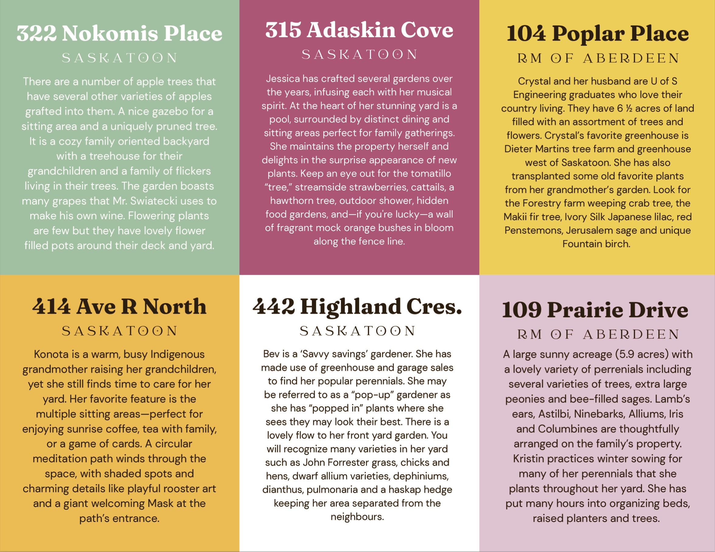 The Saskatoon Horticultural Society is thrilled to showcase seven beautiful yards & gardens around Saskatoon & Valley View Heights for the 2025 Garden Tour. Feel free to begin at any location, there will be a volunteer on site to stamp your passport & give you a voting slip. Please turn in your vote for best yard to the volunteer at your final garden. Thank you to all attending gardens & thank you for supporting the Saskatoon Horticultural Society!